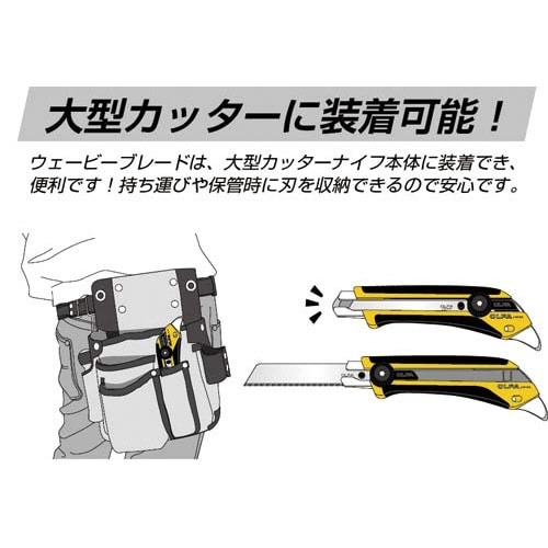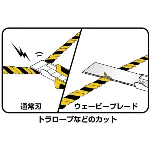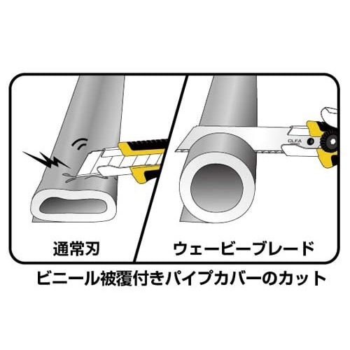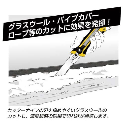 滑りやすい素材でも波形研磨刃がしっかり掛かり滑らず切る!ビニール被膜のパイプカバーやグラスウール、ロープの切断に向いています。替刃(大)を使用するカッターに付けられます。