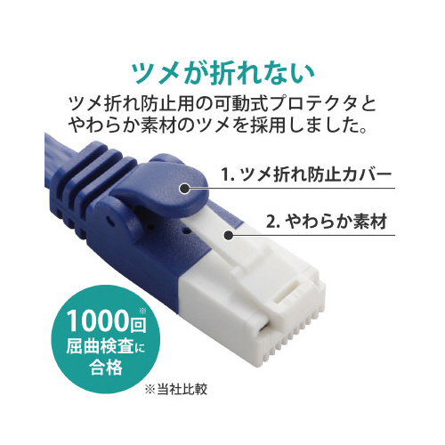 プロテクタと新素材コネクタ採用のダブル構造で、通常の使用環境では絶対にツメが折れない!薄さ1.4mmで設置場所を選ばない、カテゴリー6Aに対応したフラットタイプのLANケーブル。
