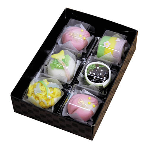 サイズが124×184×45mmのお菓子向けギフトパッケージ。和菓子6個にちょうど良い大きさとなっています。和菓子類のパッケージ、ギフト包装にいかがでしょうか。