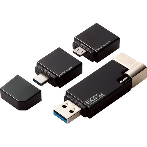USB AコネクタとLightningコネクタに加え、Type-C変換アダプタ・microB変換アダプタがついた、様々な端末でマルチに使えるUSBメモリ。