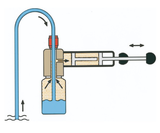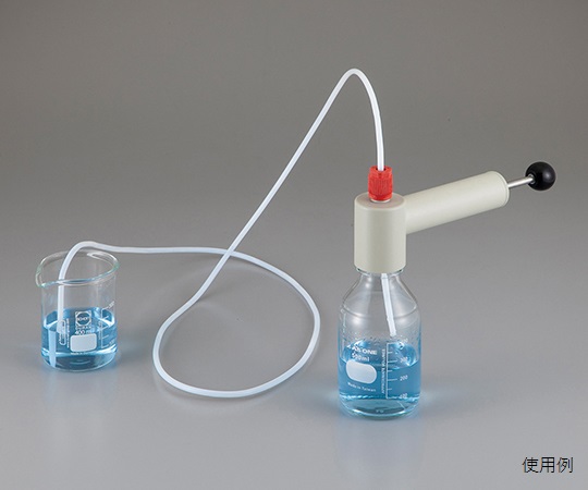 ●ボトルに取り付け、ハンドルを引くと液体を1ストロークあたり約50mL吸い上げ、チューブを通して接続したボトル内に輸送できます。(※接続したボトル内への吸引のみで、接続したボトル内の液体の吐出には使用できません。)
