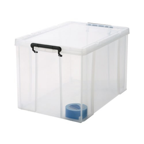 ロック式のフタ付きで丈夫な樹脂製ボックス。スタッキングもできて便利!キャスター(別売)を取り付ければ移動もラク!ロープを掛けられる溝がフタに付属。
