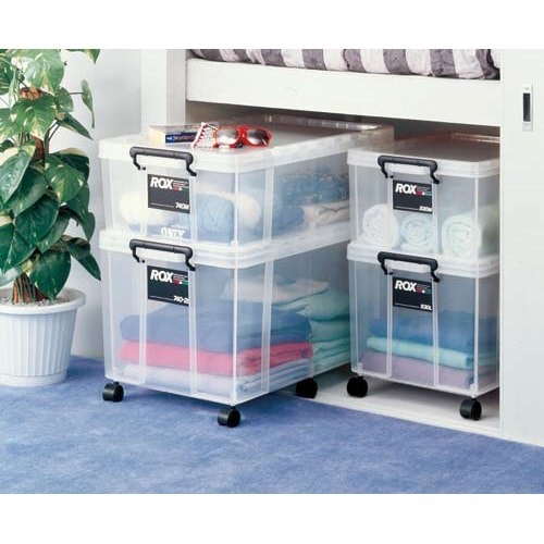 ロック式のフタ付きで丈夫な樹脂製ボックス。スタッキングもできて便利!キャスター(別売)を取り付ければ移動もラク!ロープを掛けられる溝がフタに付属。