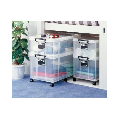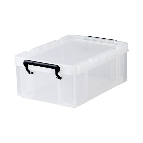 ロック式のフタ付きで丈夫な樹脂製ボックス。スタッキングもできて便利!キャスター(別売)を取り付ければ移動もラク!ロープを掛けられる溝がフタに付属。