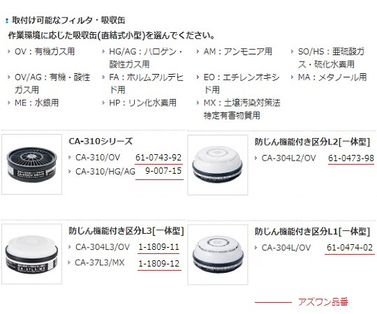 ●取付可能吸収缶:CA-304L3/OV、CA-304L2/OV、CA-304L/OV、CA-310シリーズ、CA-37L3/MX