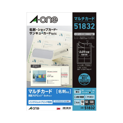 インクジェットプリンタ(IJP)で印刷できる、厚口上質紙素材の名刺用紙です。印刷後、台紙からはがすだけでフチがすっきりした名刺が作れます。落ち着いたアイボリー色。