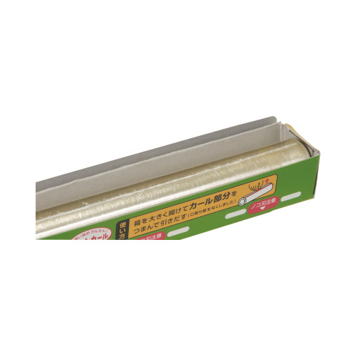密着性、粘着性の強い、業務用塩ビ製ラップ。どんな容器でもピッタリフィットし、食材のおいしさを逃しません。青果、惣菜などのパックに適し、使用用途が広いラップです。刃が底面についているプロ仕様です。