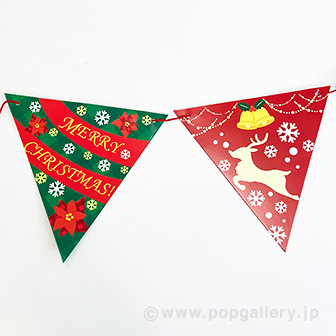 全長180cmのサイズとH20cmのフラッグは、広範囲での視認性を確保し、売り場全体のアイキャッチとして機能いたします。紙とひもで構成されており、軽量で設置しやすく、クリスマスフェアや冬の販促コーナーにおける効果的な店舗装飾にご活用いただけます。両面デザインのため、吊り下げた際にも商品の魅力をしっかりと伝えることが可能です。