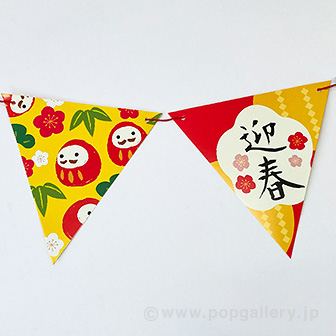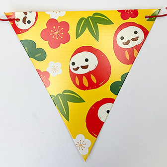 本製品「迎春だるまフラッグガーランド」は、お正月シーズンの店舗装飾に最適な、だるまモチーフのフラッグガーランドでございます。縁起の良いだるまのデザインが、売り場全体にお祝いムードと賑やかさを演出し、お客様の集客効果を高めます。