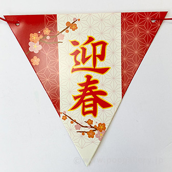 本製品「しめ縄迎春フラッグガーランド」は、お正月シーズンの店舗装飾に最適な、フラッグ型のガーランドでございます。伝統的なしめ縄のモチーフを取り入れたデザインが、華やかで賑やかな迎春の雰囲気を効果的に演出し、お客様をお迎えいたします。