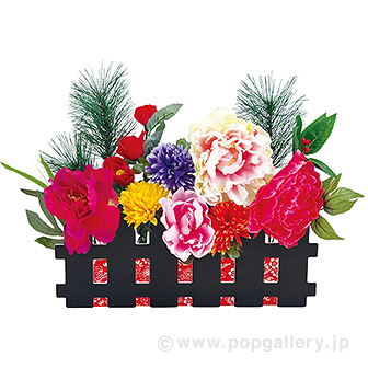 本製品「迎春垣根スタンド」は、置くだけで新年の店内にふさわしい華やかな空間を簡単に演出できる装飾スタンドです。お正月シーズンの店舗やイベント会場の入り口、商品陳列棚の横など、お客様の目につきやすい場所に設置することで、おめでたい雰囲気を高め、集客効果を促進いたします。手軽に設置が可能ですので、新年の季節イベントにおける販促ツールとして幅広くご活用いただけます。