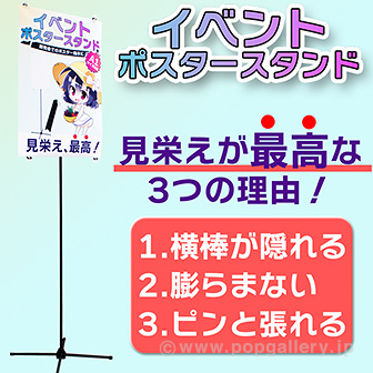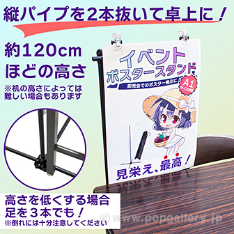本製品は、即売会や展示会などのイベント会場におけるポスター掲示に特化した、軽量で持ち運びに優れたポスタースタンドでございます。最大A1サイズまでのポスターに対応しており、高さ2mの設置サイズで高い視認性を確保し、来場者のアイキャッチとして効果を発揮いたします。