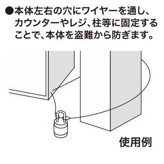 応募箱、アンケートBOX、募金箱、展示品など、一時的または常設の設置物を固定された柱や什器に接続することで、手軽にセキュリティを向上させることができます。店舗運営における防犯対策としてご活用ください。