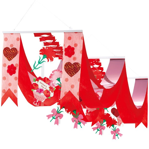 商品名: 母の日プレゼントプリーツ2連ペナントサイズ: H40×W44×L160cm材質: 不織布・紙・PVC上部ひも付上部ひもを3ヶ所吊ってご使用ください。メッキ素材がキラキラと光に反射して目を引きます