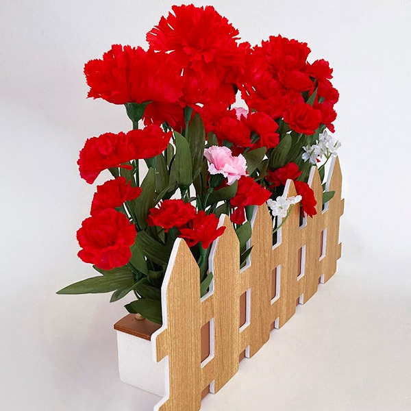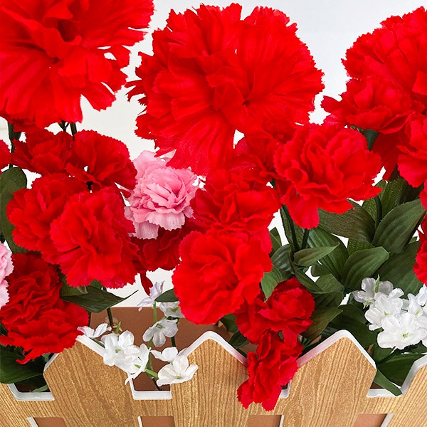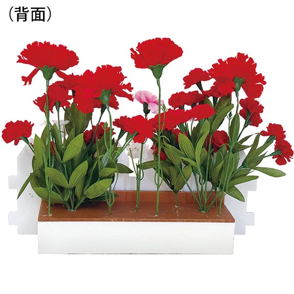 商品名: カーネーション垣根アレンジサイズ: H31×W41×D8cm材質: スチロール・ポリエステル詳細仕様: 片面、垣根:W38cm