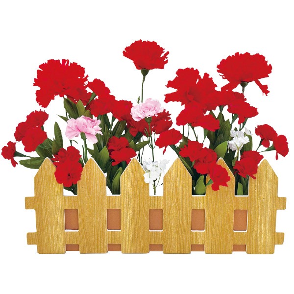 商品名: カーネーション垣根アレンジサイズ: H31×W41×D8cm材質: スチロール・ポリエステル詳細仕様: 片面、垣根:W38cm