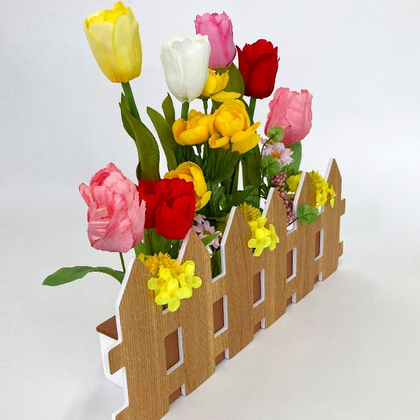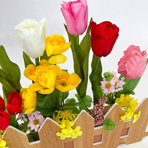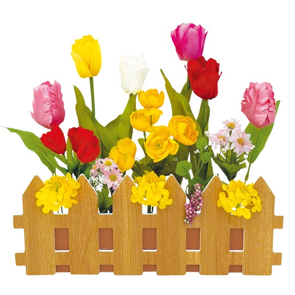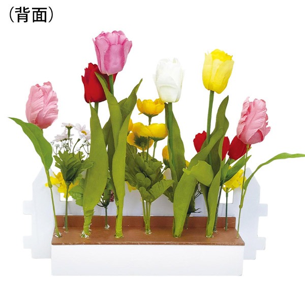 商品名: チューリップ垣根アレンジ サイズ: H35×W43×D8cm 材質: スチロール・ポリエステル 垣根幅: W38cm 仕様: 片面仕様、垣根演出には壁際への連続展開がおすすめです