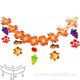 商品名: 秋の味覚ガーランド<br>サイズ: H50×L160cm<br>材質: 不織布・紙・PET<br>詳細仕様: 秋の味覚モチーフが揺れて目を引く、ひもの両端を固定するだけで設置可能・秋の味覚フェアや季節のイベントを企画されている小売店様、スーパーマーケット様<br>・店舗の雰囲気を手軽に、季節に合わせて変更されたい店舗運営者様<br>・費用対効果の高いアイキャッチ装飾をお求めの販促ご担当者様