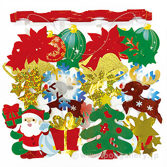 本製品「キラキラサンタプリーツハンガー」は、クリスマスシーズンの店舗装飾に最適な吊り下げ式のデコレーションでございます。プリーツ状のハンガーが立体感とボリューム感を演出し、売り場の視認性を高めます。キラキラと光を反射する素材を使用しており、華やかなクリスマスムードを効果的に作り出すことができます。上部にひもが付いておりますので、天井やメイン通路など、お客様の目線の集まる場所に簡単に設置することが可能でございます。冬季の販促活動におけるアイキャッチとして、また空間全体の装飾を賑やかにするアイテムとしてご活用いただけます。