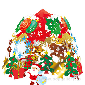 本製品「キラキラサンタセンター」は、クリスマスの販促において、売り場全体のボリュームアップと視認性向上に貢献するセンター装飾です。1箇所に吊るすだけで、放射状に広がるデザインが空間を華やかに彩り、お客様の目を引く効果的な演出を実現いたします。特に、天井の高い場所やメイン通路での設置におすすめで、遠くからでもクリスマスムードを伝えるアイキャッチとして機能いたします。