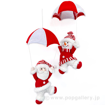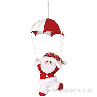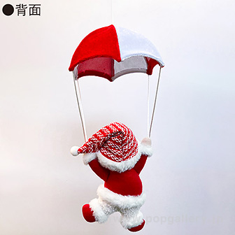 本製品「パラシュートハンガー(サンタ)」は、クリスマスの店舗装飾に最適な吊り下げ型のディスプレイアイテムでございます。サンタクロースがパラシュートで降りてくるデザインが、天井や陳列スペースにユニークな立体感と動きを演出し、お客様の視線を集めます。