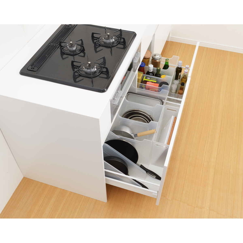 ●調味料ボトル、フライパン、洗剤などの収納に適しています。