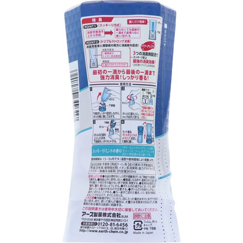 消臭芳香液を上から供給する「スッキーリ方式」だから、液残りがなく、振らなくても最後の一滴まで消臭芳香します。また、Wの消臭成分(植物成分、イオン系消臭剤)配合でトイレの嫌なニオイをしっかり消臭します。
