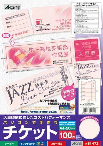 各種プリンタ兼用で印刷できる、イベントのチケット作成におすすめの半券付きのチケット用紙です。コピー機で大量印刷しやすいよう、薄めの上質紙を使用しています。白黒コピーも映えるピンク色。