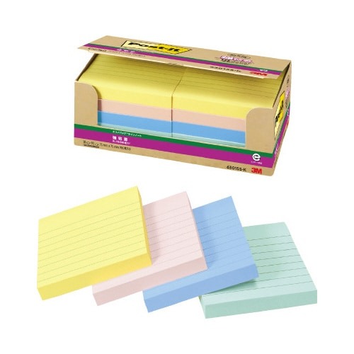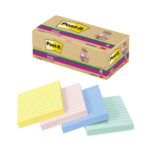 文字がきれいに書きやすい罫線入りのポストイットノート。優しい印象のパステルカラーで書いた文字が読みやすく、伝言メモなどオフィスでの使用に適しています。しっかり貼れる強粘着タイプ。お得な10冊パック。