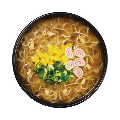 あっさりとしたしょうゆ味のスープで、ごま油の香りとカツオの旨味が効いたやさしい味わいに仕上げています。かきたま、ナルト、ねぎ、乾燥油脂のかやく入りです。