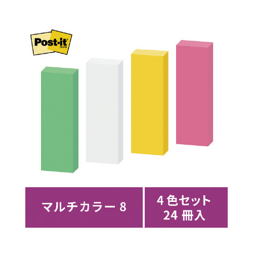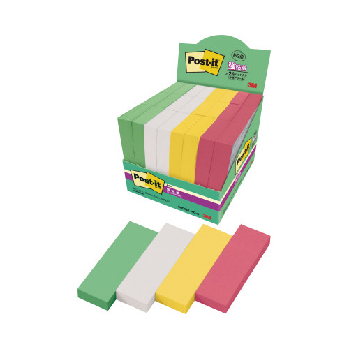 強粘着タイプのポストイット。保管しやすく、使いたい色がすぐに取り出せる収納ケースに入っています。注目を集める(フラッター)色のふせんサイズ(75mm×25mm)4色セット。