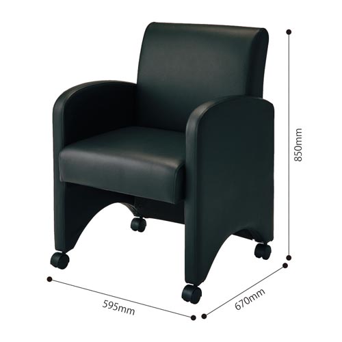キャスター付きの応接会議ソファ。張地は抗菌PVCを使用。柔らかい印象のラウンド形状の肘付き。