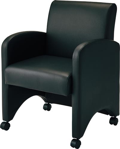 キャスター付きの応接会議ソファ。張地は抗菌PVCを使用。柔らかい印象のラウンド形状の肘付き。