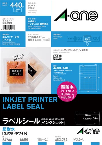 インクジェットプリンタで印刷した文字やイラストが水に濡れてもにじまず、また紙の表面が破れにくい加工を施しています。冷蔵庫から取り出したガラス瓶などが結露してもはがれにくいラベルシールです。