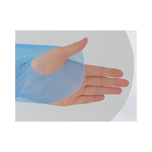 全長約1120mmフリーサイズ。使いきりタイプで袖付・親指フックタイプのエプロンです。ポリエチレン製で衣服等に水分、油分の付着を防ぎます。食品衛生法で定められた材質・溶出試験適合品。個包装です。