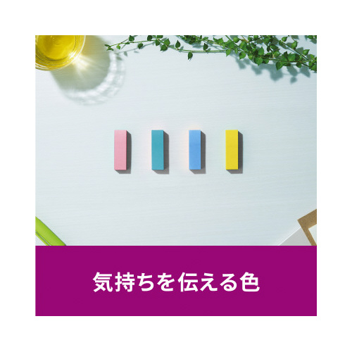 強粘着タイプのポストイット。保管しやすく、使いたい色がすぐに取り出せる収納ケースに入っています。気持ちを伝える色(フラワー)4色セット。