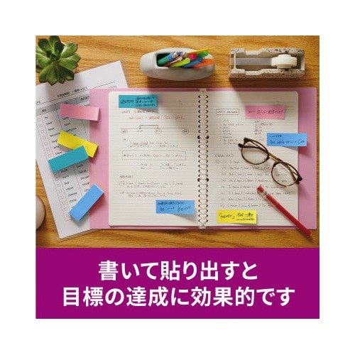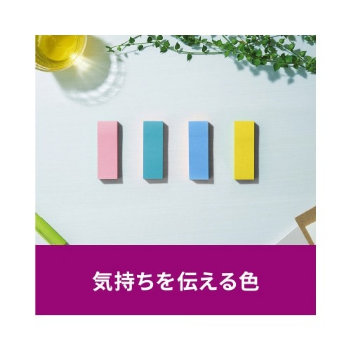 強粘着タイプのポストイット。保管しやすく、使いたい色がすぐに取り出せる収納ケースに入っています。気持ちを伝える色(フラワー)4色セット。