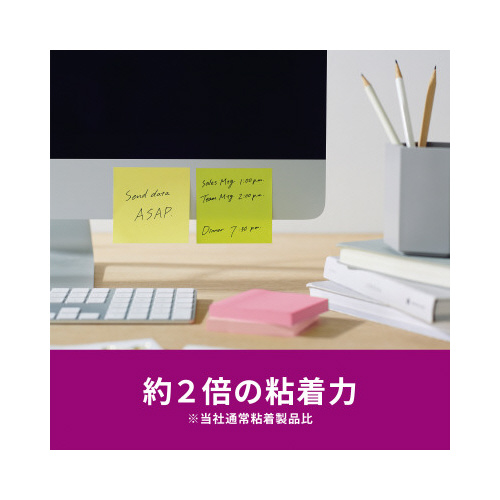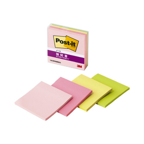 強粘着タイプのポストイット。保管しやすく、使いたい色がすぐに取り出せる収納ケースに入っています。気持ちを伝える色(サクラ)4色セット。