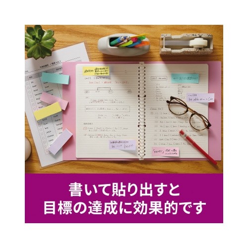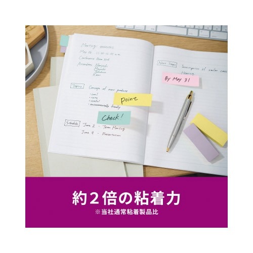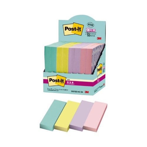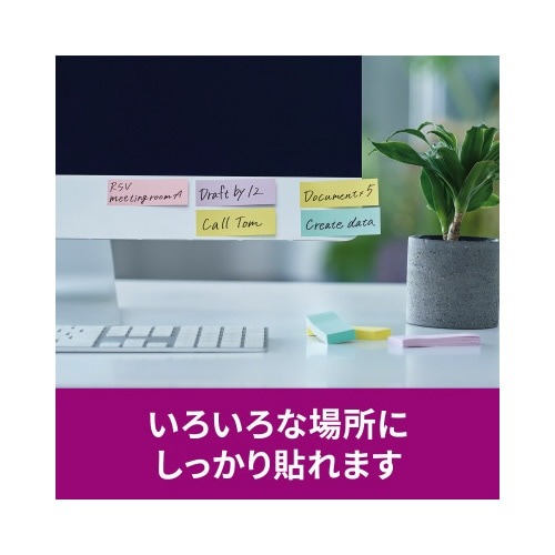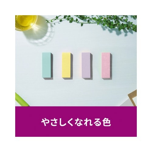 強粘着タイプのポストイット。保管しやすく、使いたい色がすぐに取り出せる収納ケースに入っています。やさしくなれる色(スイーツ)4色セット。