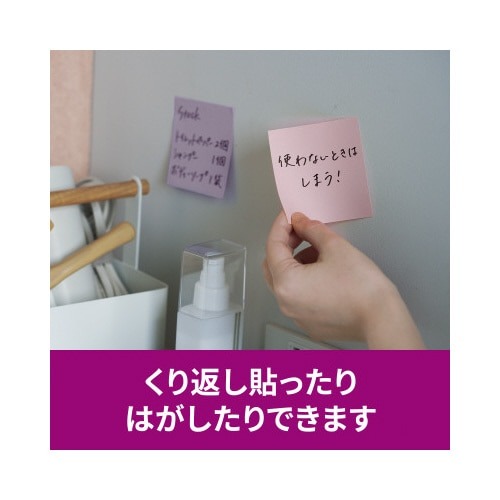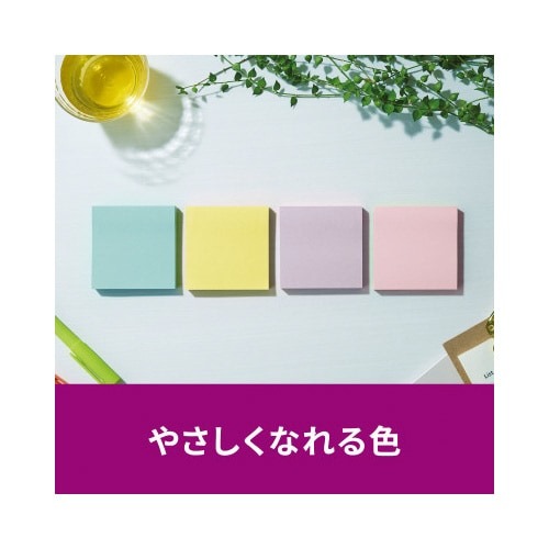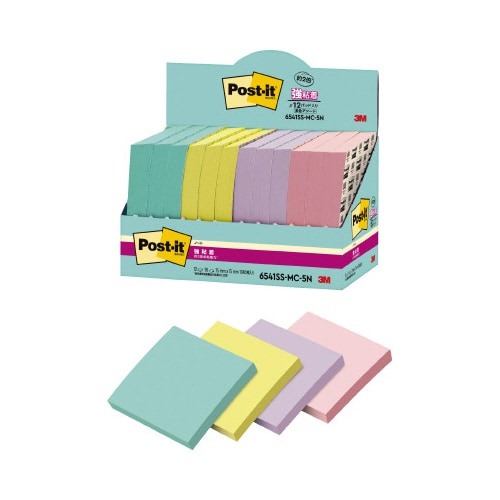 強粘着タイプのポストイット。保管しやすく、使いたい色がすぐに取り出せる収納ケースに入っています。やさしくなれる色(スイーツ)4色セット。
