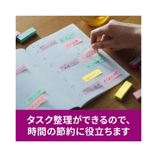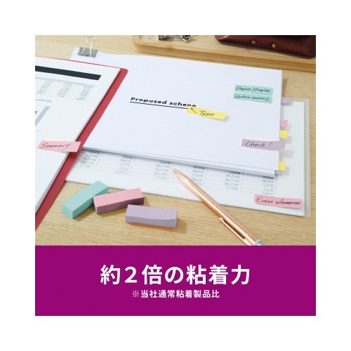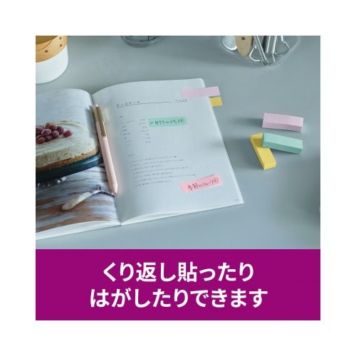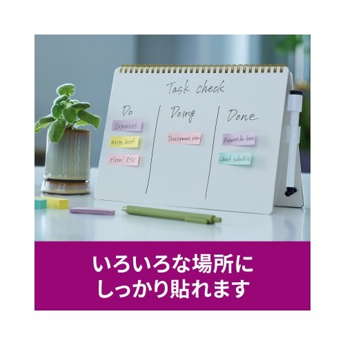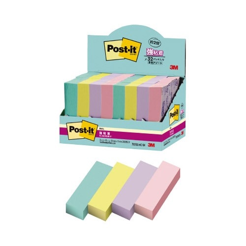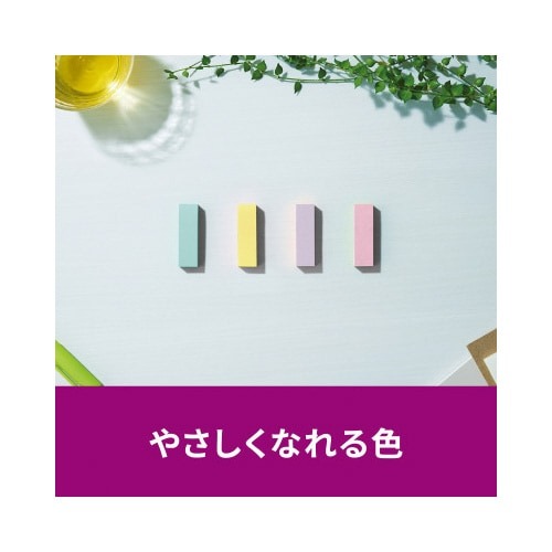 強粘着タイプのポストイット。保管しやすく、使いたい色がすぐに取り出せる収納ケースに入っています。やさしくなれる色(スイーツ)4色セット。
