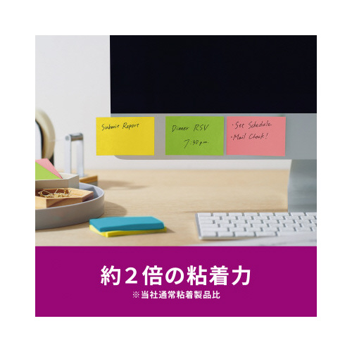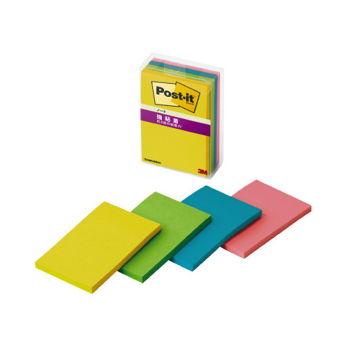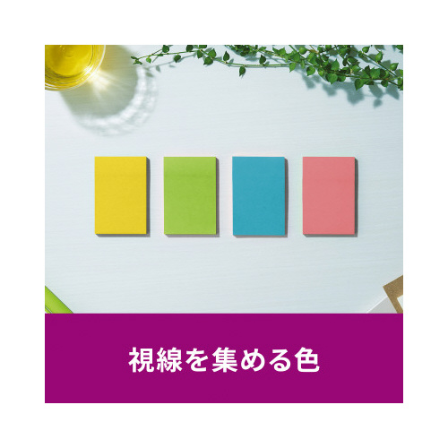 強粘着タイプのポストイット。保管しやすく、使いたい色がすぐに取り出せる収納ケースに入っています。視線を集める色(グッピー)4色セット。