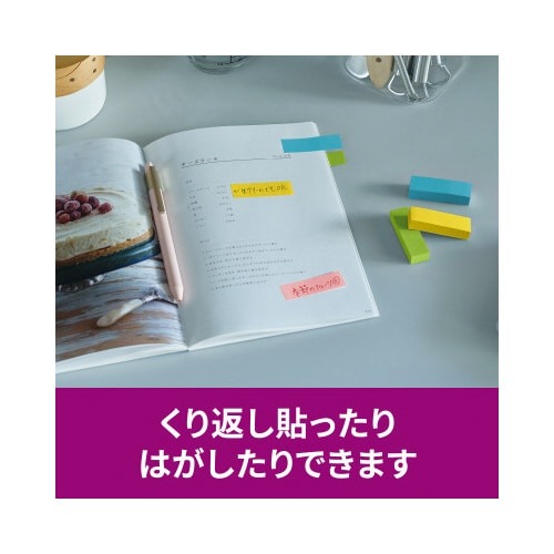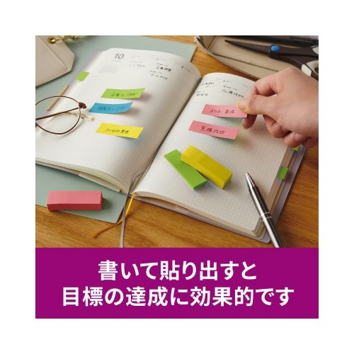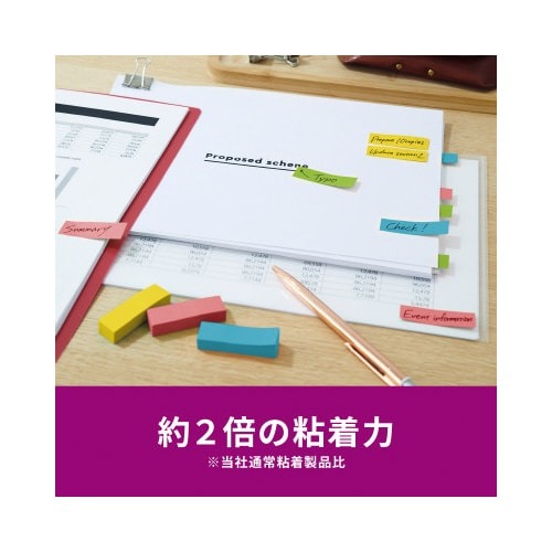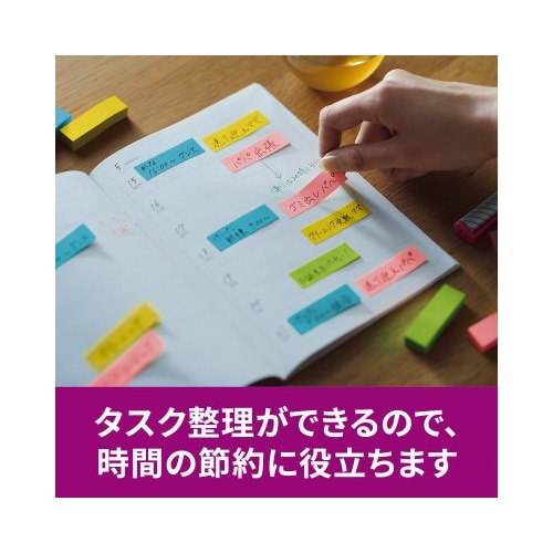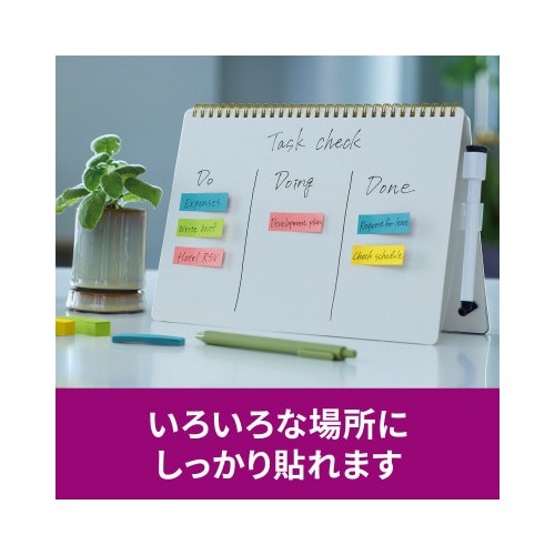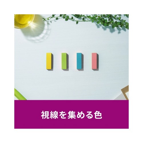 強粘着タイプのポストイット。保管しやすく、使いたい色がすぐに取り出せる収納ケースに入っています。視線を集める色(グッピー)4色セット。
