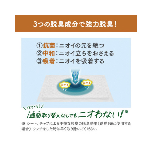 1週間取り替えなしでもニオわない!※1オシッコの色がわかりやすい白色シート。※1 チップ、シートによる不快な尿臭の脱臭効果(愛猫1頭に使用する場合)ウンチをしたときは早く取り除いてください。