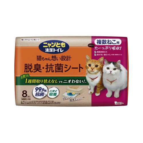 ●使用期間/愛猫2頭の場合 1枚で約1週間 愛猫3頭の場合 1枚で約4ー5日間 愛猫4頭の場合 1枚で約3ー4日間 ※愛猫1頭で2週間使用できるシートではありません。(愛猫の尿量は、体重や季節、年齢等によって変化します。尿量が多い場合は、シートが吸収しきれなくなることがあるので、早めに交換してください。)