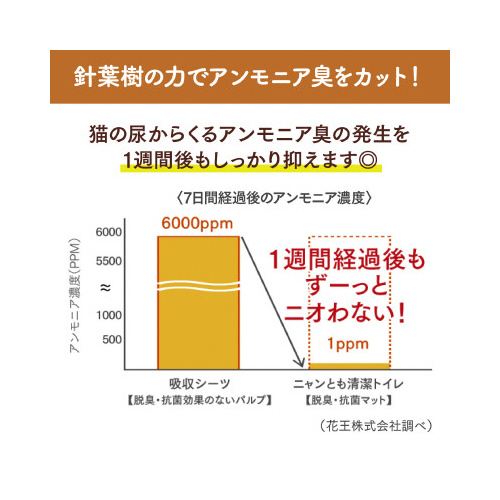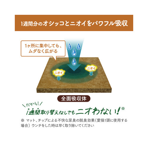 天然素材の針葉樹の効果で1週間取り替えなしでもニオわない!※1アンモニア臭をカット。※1 チップ、マットによる不快な尿臭の脱臭効果(愛猫1頭に使用する場合)ウンチをしたときは早く取り除いてください