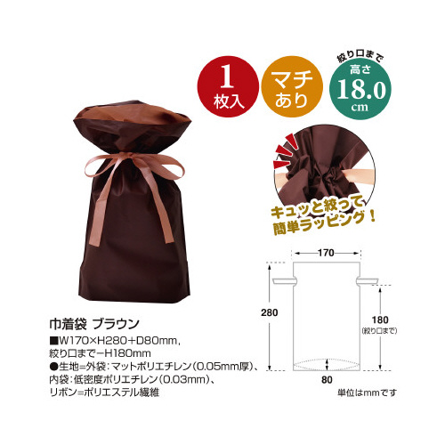 中身を入れたら、両サイドのリボンを引っ張るだけで簡単に包める袋です。ご家庭でも店舗でもお使いいただけるラッピング用巾着袋です。外袋はマットな手触りの梨地、内袋は光沢のある二重袋です。