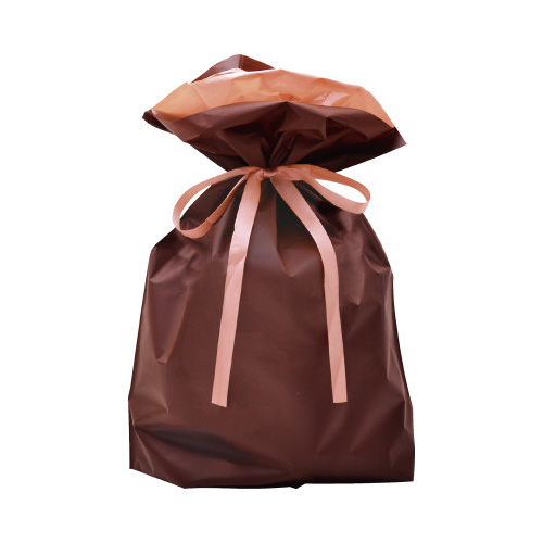 中身を入れたら、両サイドのリボンを引っ張るだけで簡単に包める袋です。ご家庭でも店舗でもお使いいただけるラッピング用巾着袋です。外袋はマットな手触りの梨地、内袋は光沢のある二重袋です。