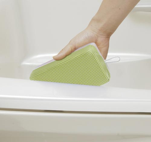 1つ2役のスポンジです。用途に応じて表裏の使い分けができます。グリーンのクロス面は超極細繊維(マイクロファイバー)。キズをつけずに水だけで汚れをスッキリ落とします。