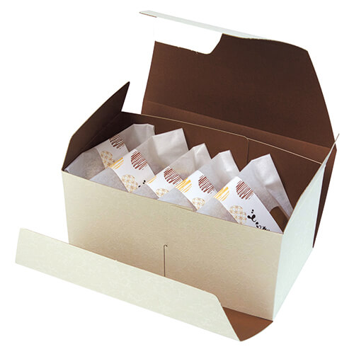 サイズが208×114×100mmのお菓子向けギフトパッケージ。どら焼5個にちょうど良い大きさとなっています。和菓子類のパッケージ、ギフト包装にいかがでしょうか。